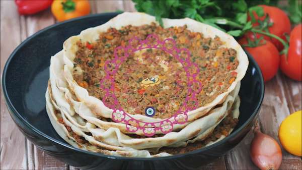 Malzemeler: (8 lahmacun icin) 1 kap=1 cup=240 ml. Hamur icin: 1 kap ilik su 2 yemek kasigi zeytin yagi 1 tatli kasigi tuz 1 cay kasigi seker 1 tatli kasigi instant maya 3 kap un Uzeri icin: 200 g. orta yagli kiyma 1 buyuk sogan (rendelenmis) 1 tatli kasigi domates salcasi 1 tatli kasigi aci biber salcasi 2 domates (rendelenmis) 2 dis sarimsak (rendelenmis) 2 sivri biber (ince dogranmis) 1/4 demet maydonoz (ince dogranmis) 1 tatli kasigi kirmizi toz biber Tuz, taze cekilmis karabiber Yapilisi: Hamur icin un disindaki butun malzemeyi karistirin ve en son unu ekleyip iyice yogurun. Ekstra un eklemek gerekirse azar azar ilave edin. Uzerini strec film ile sarip ilik bir yerde 1 saat kadar mayalanmasi icin birakin. Butun ic harci malzemelerini karistirin. Mayalanan hamuru sondurun ve mandalina buyuklugunde parcalar koparin. Hafif unlanmis tezgahta buyukce bir tabak buyuklugunde acin. Teflon tavanizi isitin ve orta ateste tutun. Actiginiz hamuru tavaya yerlestirip ustune ic harc karisimindan 2 yemek kasigi kadar koyup kasik yardimi ile iyice yayin. Tavanin kapagini kapatin ve yaklasik 4 dk. altinin yanmamasi icin kontrol ederek pisirin. Sogan ve yesillikler ile servis yapin. Afiyet olsun...