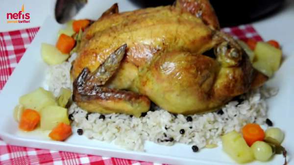 Fırında Bütün Tavuk Tarifi Malzemeler 1 adet bütün tavuk (2.200 kg) 2 adet patates 2 adet havuç 15 adet arpacık soğan 5-6 diş sarımsak 8-10 defne yaprağı tuz karabiber sosu için; 1 yemek kaşığı bal 1 yemek kaşığı zeytinyağı 1 yemek kaşığı limon suyu 1 çay kaşığı tuz Hazırlanışı Tavuk yıkanır, tüyleri tütsülenir ve fırın kabına göğsü yukarı olacak şekilde yerleştirilir. 185 derece fırında 70 dakika pişmeye bırakılır. 70 dakikanın sonunda fırından çıkarılarak etrafına irice kesilen patates ve havuçlar yerleştirilir. Az tuz ve karabiber serpilir. Defne yaprakları, sarımsaklar ve arpacık soğanlar boşluklara bırakılır. Hatta tavuğun içine de birkaç diş sarımsak ve soğan atabilirsiniz. Bir kasede sos malzemeleri karıştırılarak fırça yardımı ile tavuğun üzerine sürülür. Böylelikle tavuğun üzeri daha parlak olacaktır. Fazla bekletilmeden tavuk tekrar fırına sürülür. 50-60 dakika daha fırında pişirildikten sonra tavuğumuz iyice pişmiş olacaktır. Bir kürdan veya bıçak batırarak pişip pişmediğini kontrol edebilirsiniz. Beraberinde pişen sebzelerle birlikte servis tabağına alarak servis edebilirsiniz. Afiyet olsun. Servis önerisi olarak yanında fıstıklı kuş üzümlü iç pilav tarifimizi öneririm.