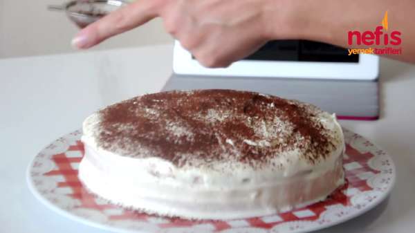 Öncelikle muhallebi için şeker, un, süt ve yumurta çırpılarak ocakta kaynayıncaya kadar karıştırılarak pişirilir. Kaynadıktan sonra altı kapatılarak ılımaya bırakılır. 15dk kadar bekleyip ılındıktan sonra labne peyniri ilave edilip mikser ile pürüzsüz hale gelene kadar çırpılır. Diğer taraftan sıcak su içinde hazır kahve çözdürülerek hazırlanır ve hafif soğuması beklenir. Servis tabağına pandispanya kekinin bir katı yerleştirilerek kahvenin yarısı ile ıslatılır. Üzerine kremanın yarısı ilave edilip kalan kahve ile üst kat da ıslatıldıktan sonra ikinci kat kapatılır. Kalan krema da dökülerek pastanın üzeri ve kenarları güzelce kapatılır. Son olarak pastanın üzerine süzgeç yardımı ile kakao serpilir. Buzdolabında birkaç saat dinlendirildikten sonra dilimlenerek servis edilir. Afiyet olsun…