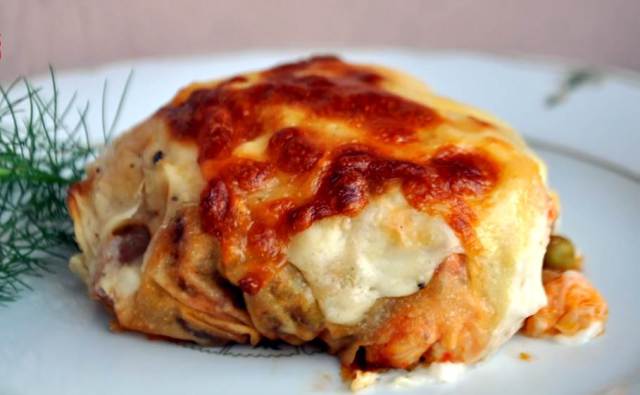 2 adet yufka 400g tavuk göğsü 400g tavuk pirzola 1 adet kuru soğan 2 yemek kaşığı domates salçası (1 kaşığını ketçap kullanabilirsiniz) 1 su bardağı haşlanmış ya da konserve bezelye 1 adet patlıcan Pulbiber Kekik Karabiber Tuz Beşamel sos için: 1,5 yemek kaşığı un 1,5 su bardağı süt 2 yemek kaşığı tereyağı Tuz Üzeri için: Kaşar peyniri rendesi Hazırlanışı Patlıcanı alacalı soyarak küçük küçük doğrayın ve sıvı yağ ile kızartın. Süzgece alarak yağının süzmesi bekleyin bu arada tavukları soteleyin. Tavukları kuş başı doğrayın, tencereye alarak arada karıştırarak pişirin. Rengi dönüp suyunu saldığında yemeklik doğranmış soğanı ekleyin. Soğanlar yumuşadıktan sonra salçayı ve isteğe bağlı kullanacaksanız eğer ketçapı ilave edin. Kapağını kapatarak 4-5dk kadar pişmeye bırakın. Suyunu çektikten sonra bezelye ve patlıcanı ilave edin. Baharatları da ekleyerek 3-4dk daha pişirin. Tavuklar da artık pişmiş olmalılar. Beşamel sos için tereyağını eritin ve unu kokusu çıkana kadar kavurun. üzerine sütü ilave ederek çırpıcı yardımı ile topak kalmayacak şekilde koyulaşıp göz göz olana kadar karıştırarak pişirin. Son olarak tuzunu ilave ederek ocaktan alın. Küçük bir kaseye 4`e böldüğünüz yufkadan serin. Yufkanın kenarlarından parçalar kopartarak çukur olan kısma bir kat daha serin. Kaseye tavuklu harçtan koyarak, kasenin kenarlarından sarkan yufkaları üzerine kapatın. Yağlanmış fırın kabına ters çevirin. Tüm malzemeyi bu şekilde yaptıktan sonra üzerleri beşamel sostan her birine eşit miktarda olacak şekilde dökün. 190 derece fırında yufkalar pembeleşene kadar pişirin, sonra üzerine kaşar peyniri rendesi serpin ve tekrar fırına sürün. Peynirler eriyip kızardığında alabilirsiniz. Not: sadece tavuk göğsü ile de yapabilirsiniz ama ben göğüs eti kuru olduğu için sote yaparken ya pirzola kullanıyorum ya da bu şekilde karıştırıyorum.