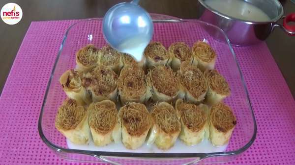 Kadayıf ve hazır baklava yufkası ile yapılan nefis bir tatlı tarifimiz var, bu pratik tarifi mutlaka denemelisiniz. Kadayıf sarma nasıl yapılır? 2 kat baklava yufkası düz bir zemine alınır. Yufkanın üzerine yaş kadayıftan serilir ve iri çekilmiş ceviz serpilir. Yufka rulo yapılarak 2 parmak genişliğinde dilimlere kesilir. Kesilen dilimlerin kadayıf kısımları üstte olacak şekilde fırın kabına yerleştirilir. Üzerlerine eritilmiş tereyağı gezdirilir. 180 derece önceden ısıtılmış fırında kadayıflar kızarana kadar pişirilir. Şerbeti için 3 su bardağı süt ve 2,5 su bardağı şeker tencereye alınarak kaynatılır. Pişen tatlının ilk sıcaklığı çıkınca ılık sütlü şerbet her yerine dökülür. Tatlımızı 2-3 saat dinlendirdikten sonra servis yapabilirsiniz. Afiyet olsun
