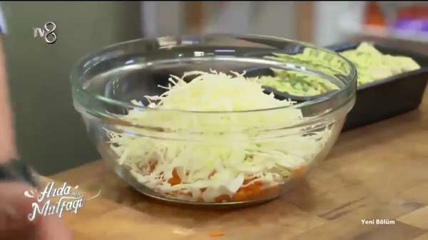 Tavuklu Lahana Salatası (Coleslow) Malzemeleri 2 adet tavuk göğsü – haşlanmış ve didilmiş 300 gr. lahana – ince yapraklarından 2 adet havuç 1 adet kuru soğan Sosu için Malzemeler 2 yemek kaşığı üzüm sirkesi 2 yemek kaşığı mayonez 4 yemek kaşığı süzme yoğurt 1 yemek kaşığı toz şeker 1 yemek kaşığı hardal Tuz Karabiber Soğanın kabuğunu soyun bir sos tenceresinde bütün olarak 3-4 haşlayın sudan alın ve soğuması için kenara alın. Lahanayı çok çok ince kıyın. Havuçların kabuklarını soyup uzun uzun rendeleyin. Soğuyan soğanı da ince ince piyazlık doğrayın. Haşlanmış tavuğu lif lif olmayacak şekilde didin. Tüm sebzeleri ve tavuğu geniş bir kaseye alın. Ayrı bir kapta sos için olan tüm malzemeleri iyice karıştırın ve salatanın üzerine döküp iyice karıştırın ardından servis edin. Arda Türkmen; bu programda "Sarımsaklı Peynirli Ekmek", "Tavuklu Lahana Salatası" ve "Vişneli Mekik" tariflerini sizlerle paylaşıyor. Arda Türkmen, birbirinden lezzetli ve pratik yemek tarifleriyle her Cumartesi ve Pazar TV8 ekranlarında.